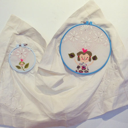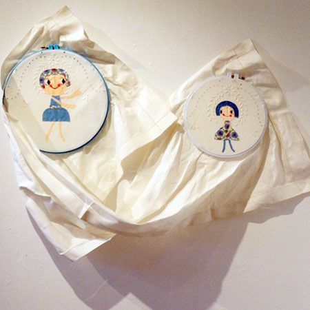 My work includes a series titled “flower faces” which are made up of collaged together bits of vintage embroidery, doilies and linens.